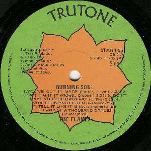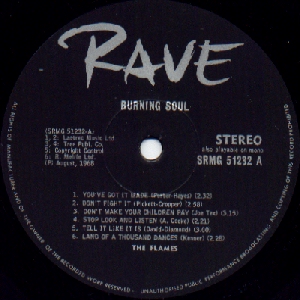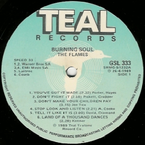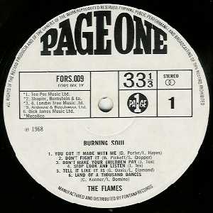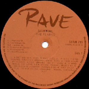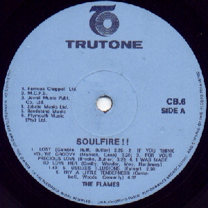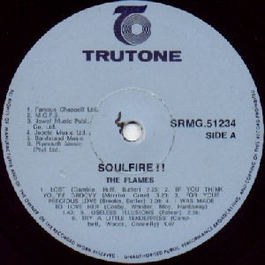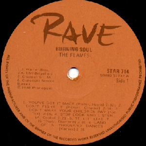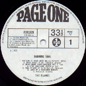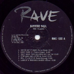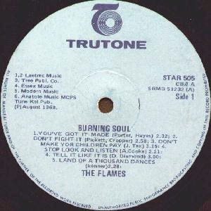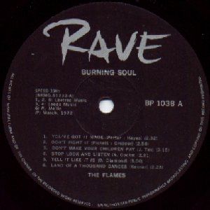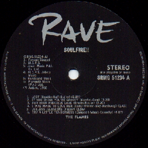 This is an overview of the many different original and later LP pressings of the Flames' albums Burning Soul and Soulfire. In compiling this overview we are making the rather bold assumption that these two albums were always reissued in pairs. We welcome your contributions with information about missing versions! It would appear that those people in the record company responsible for reissuing these records were not too careful about making sure they were using the correct stereo tapes and/or matrices. It is nearly certain that the original master tapes for all this music are lost. That would explain why a true stereo Soulfire never reappeared after the first 1968 version. Tracks from Soulfire have consistently shown up in mono on various compilation records and cds.